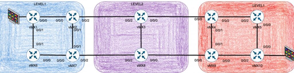 Пример: vMX1 полностью в домене Level 1, тогда как vMX2 имеет две связи в Level 1 и одну связь в Level 2. vMX3 полностью в домене Level 2. Связь vMX4 с vMX9 находится как в Level 1, так и в Level 2 одновременно. Два уровня являются отдельными топологиями, и связь существует в обеих.