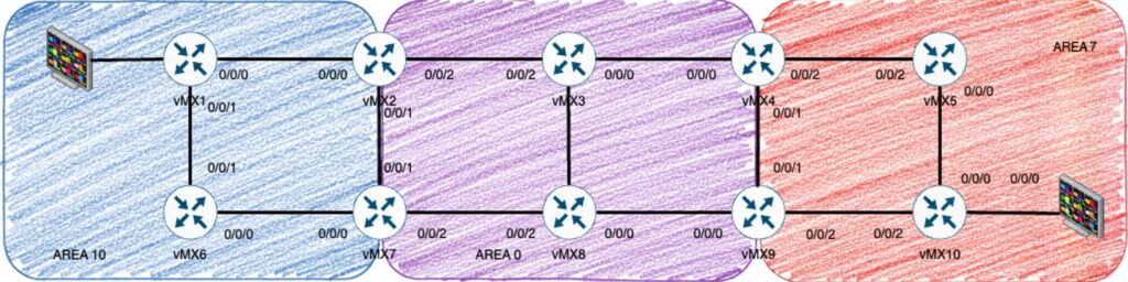 Area Border Router (ABR) имеет одну связь в Area 10 и одну связь в Area 0. ABR знает топологию обеих областей. Например, vMX2 на диаграмме имеет интерфейс ge-0/0/0 в Area 10 и другие два интерфейса в Area 0. Это означает, что vMX2 имеет две отдельные базы данных, по одной для каждой топологии.