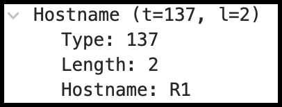 Всё просто! TLV Hostname имеет тип 137 и длину два байта, но важно, что hostname — R1. И эта TLV может появиться в любом месте пакета. Порядок не важен.