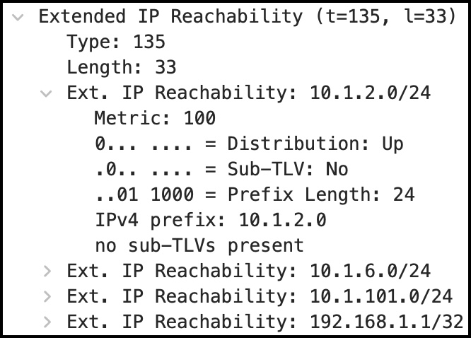 «Extended IP reachability» очень похоже — это просто список IP-адресов, настроенных на маршрутизаторе, и их стоимость. Снимок экрана показывает, что R1 декларирует четыре префикса. Открыв префикс 10.1.2.0/24, видим детали: метрика, длина префикса, сам префикс — всё ожидаемое.