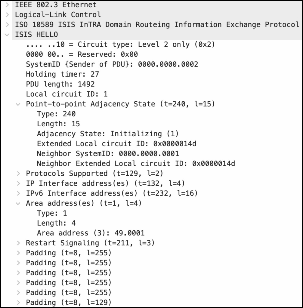 Hello-сообщения имеют собственный уникальный заголовок, немного отличающийся от заголовка LSP. Помимо уже виденного System ID, заголовок содержит Holding Time (что OSPF называет dead interval) — время ожидания перед объявлением соседства мёртвым. Здесь это 27 секунд — трижды по девять.