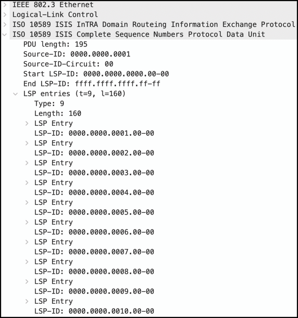 Поэтому они не отправляют полное содержимое базы данных IS-IS. Вместо этого отправляют сводку в сообщении CSNP — Complete Sequence Number PDU.