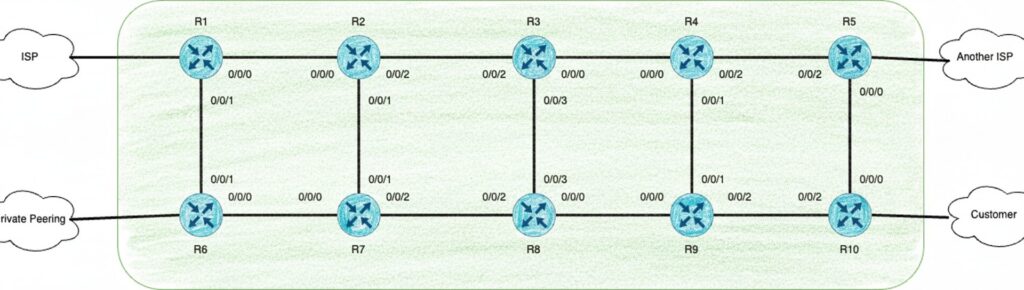 . Эта команда отображает все маршрутизаторы в сети. В выводе ниже видно десять маршрутизаторов — и в отличие от OSPF, они перечислены по именам!